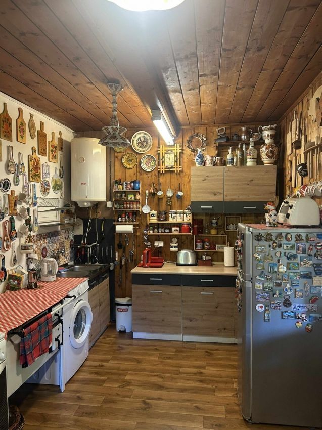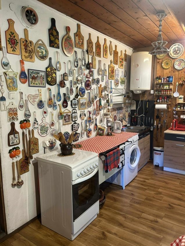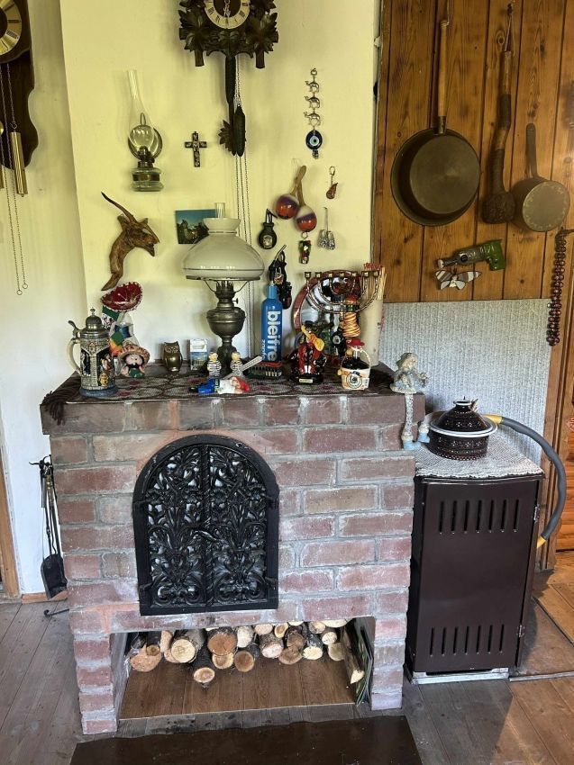 Wnętrze utrzymane jest w stylu wiejskim, z dbałością o detale i zabytkowe, drewniane meble, co podkreśla jego niepowtarzalny klimat i przytulność. Dom jest sprzedawany z kompletnym wyposażeniem również ze sprzętem potrzebnym do utrzymania ogrodu. Dodatkowo w budynku znajduje się garaż.