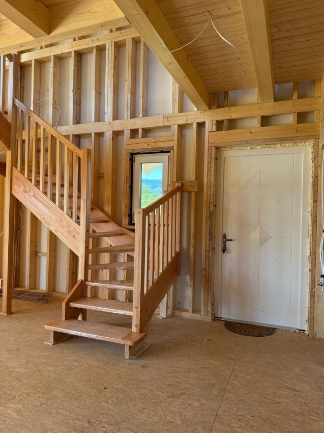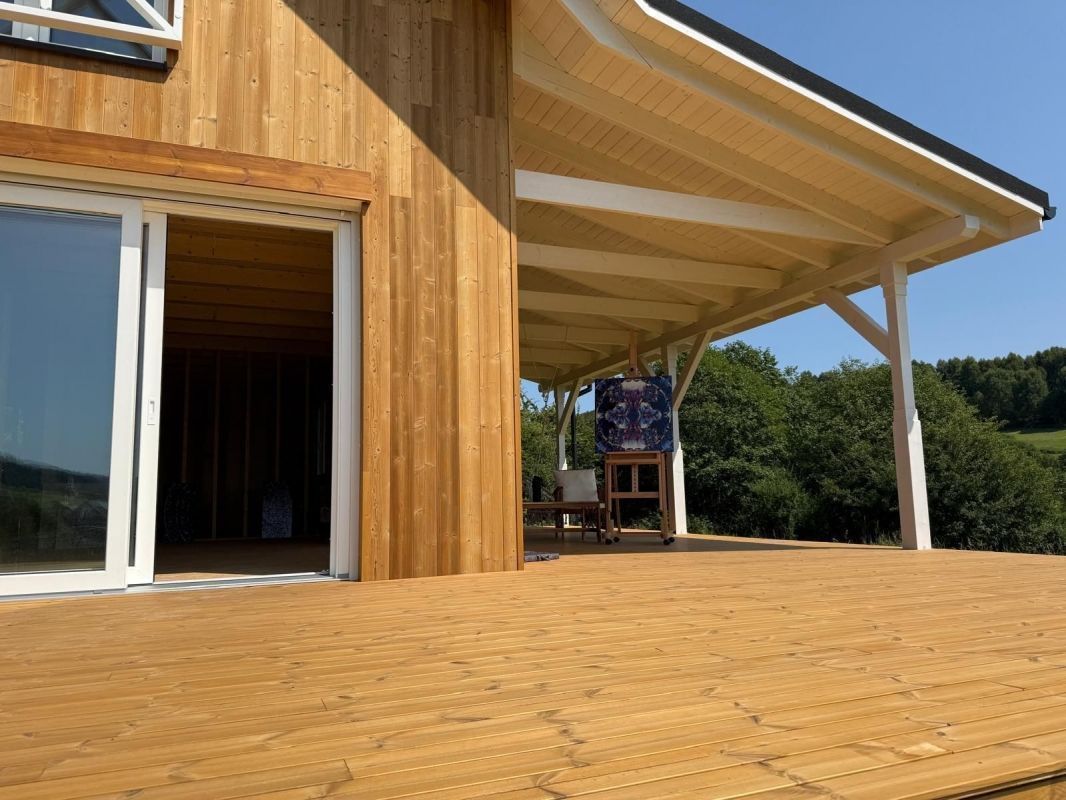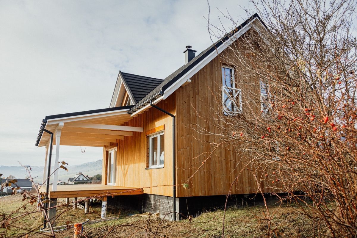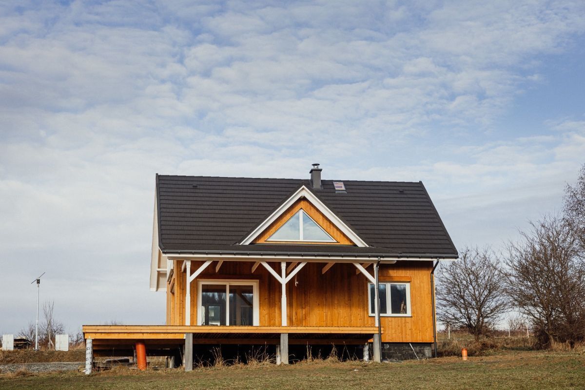 Ta drewniana perełka, zbudowana z pasją przez właścicielkę, to harmonijne połączenie naturalnych materiałów i nowoczesnych rozwiązań. Najwyższa jakość zastosowanych surowców, w tym zamówiona Thermo deska na tarasie i elewacji, gwarantuje trwałość, solidność oraz niepowtarzalny urok. Pokrycie dachowe z firmy GERARD, okna plastikowe firmy Drutex, schody wewnętrzne drewno - daglezja, drzwi główne drewniane.