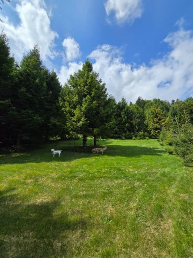 Na działce znajduje się starannie założony sad, posadzony dwa lata temu, z drzewami owocowymi, krzewami i drzewami iglastymi. Furtka prowadzi bezpośrednio do lasu, co zapewnia intymność i kontakt z naturą. Działka jest częściowo ogrodzona, uzbrojona w prąd - kabel znajduje się w granicy działki - a także podłączenie do kanalizacji.