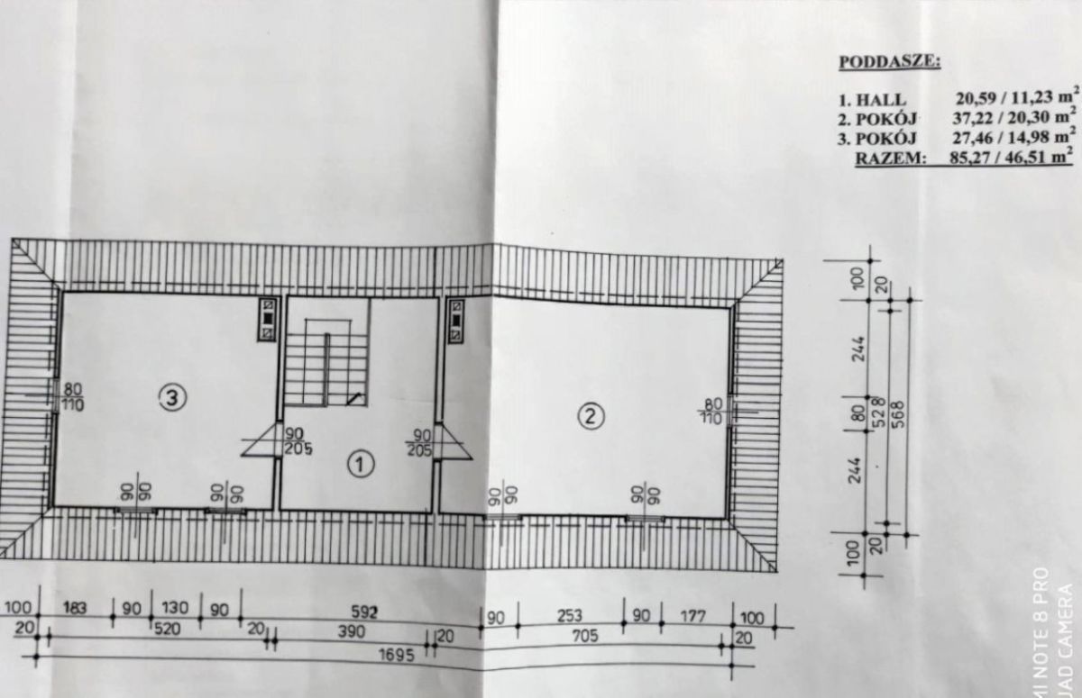 PODDASZE ; hol 11,23m2, Pokój I - 20,30 m2, Pokój II - 14,98 m2. Ogólna powierzchnia na poddaszu 46,51 m2.