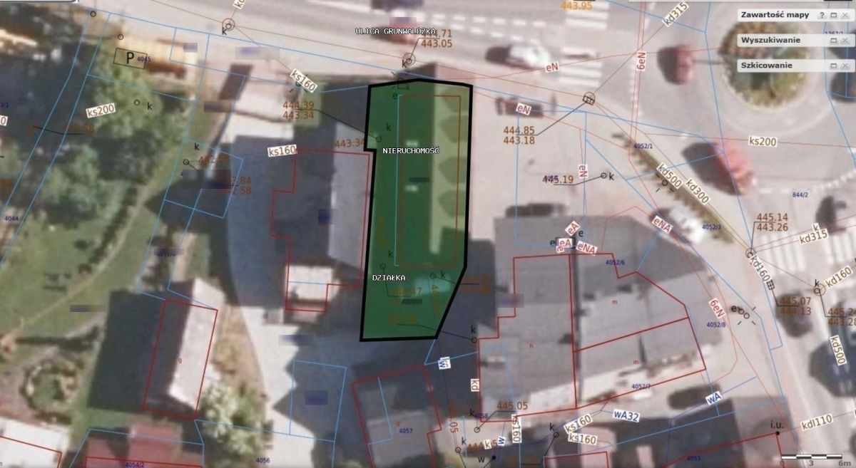 Nieruchomość ewidencyjnie składa się z dwóch działek o łącznej powierzchni 285 m2. Od strony zachodniej budynku oraz południowej znajduje się wolna przestrzeń działki na przykład na parking.